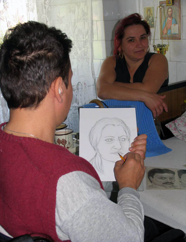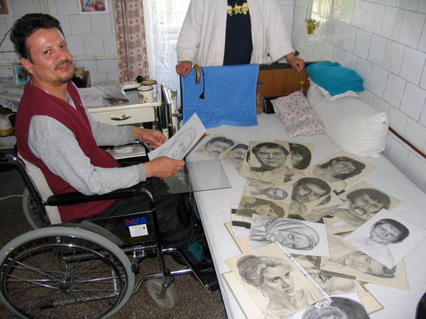 Daniel, într-o demonstrație a talentului său Este greu de crezut cât de mult se poate schimba viata unui om. Într-o clipa, dintr-o greseala sau nu, se poate curma brusc totul. Poate vizita la un astfel de centru care „gazduieste” acesti oameni este cel mai bun exemplu. Am pornit spre Centrul de Îngrijire si Asistenta din Branisca pentru a afla povestea portretistului care îsi poarta traiul aici. Primul pas. Intrarea în curtea azilului te copleseste. În stânga si în dreapta banci. În fata cladirii stau aliniate scaunele cu rotile ale bolnavilor. Lânga ele, ca si cum ar sta de veghe, trei câini. Din cladire iese în fuga o femeie. Îmbracata ciudat si cu o privire stranie se plimba în stânga si în dreapta. Vorbeste singura. Se asaza pe o banca si se uita la noi, parca în gol. Este evident ca femeia traieste într-o lume proprie. Odata intrat în cladire, te loveste un miros izbitor. Într-unul din saloanele pavilionului, ne asteapta Daniel Cozma, caci despre el este vorba. „Un om cald si cu un suflet mare”, asa se spune despre el. Numai ca pe lânga aceste calitati, Daniel a fost înzestrat cu un talent deosebit. El face grafica în creion. Lucrarile lui, portretele unor oameni, sunt foarte reusite, astfel încât ai impresia ca acele chipuri asternute pe hârtie nu sunt conturate de mâna unui om. Peste o suta de portrete Daniel Cozma are 45 de ani si „locuieste” în Centrul de Îngrijire si Asistenta din Branisca de mai bine de 10 ani. Într-un salon care se vrea a fi o camera. Pe pereti multe icoane. În stânga, are amenajata o mica biblioteca. Pentru ca, atunci când nu face portrete, Daniel citeste foarte mult, carti biblice si nu numai. A venit aici nu pentru ca e ca „restul”, ci pentru ca a suferit un accident de munca, la Râu Mare, unde lucra ca subinginer, si în urma caruia a ramas cu picioarele paralizate. Îi este greu sa vorbeasca despre trecutul lui. De altfel, evita sa o faca. În pofida handicapului pe care îl are, Daniel Cozma este un om normal, simplu, poate prea simplu. Dar mai mult decât atât, are un talent nativ. Nu l-a învatat nimeni sa faca portrete, asa i „s-a aratat”. Cu un gest timid, scoate dintr-o mapa lucrarile lui. Zeci de portrete. De la Alain Delon si Florin Piersic pâna la colegii lui din Centrul de Îngrijire si Asistenta. Rar am vazut atâta sârguinta într-un singur om. A început cu un autoportret. „Cel mai la îndemâna mi-a fost sa iau o oglinda”, spune cu o voce înceata Daniel. Asa a observat din mai multe unghiuri propriul sau chip si si-a format o imagine mai complexa asupra a ceea ce dorea sa deseneze. Dupa care a început sa faca portrete uitându-se la fotografiile actorilor, scoase din reviste. Asta se întâmpla cu 19 ani în urma. De atunci a continuat. Acum e suficient sa te priveasca o singura data pentru a-ti zugravi trasaturile pe coala de hârtie.