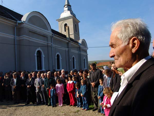 Localnicii din Bosorod au asistat cu mic, cu mare, la resfintirea bisericii lor vechi de aproape 100 de ani Sub soarele zgārcit de octombrie, zeci de oameni se aduna īn jurul bisericii, situate īn centrul satului. Sunt īmbracati frumos, asa de īngrijit īncāt ai crede ca merg la o nunta. Barbatii poarta toti costume, iar pantofii le sunt lustruiti „ca la carte”. Femeile si ele sunt īn „hainele cele bune”, cu baticuri pe cap. Asa cere traditia locului: femeile maritate sunt aproape obligate sa poarte naframa. Tinerele care nu si-au gasit īnca feciorul sunt lasate si fara. Indiferent de vārsta īnsa, toti intra īn biserica. Cei mici sunt trimisi „īn pod”, cum i se spune balconului din interiorul bisericii. Īn scurt timp lacasul devine neīncapator. Toata lumea se pune pe mai multe rānduri īn liniste. Nimeni nu schiteaza nici un gest brusc, sau evident. Aglomeratia e mare pentru ca are loc slujba de resfintire a bisericii. Edificiul a trecut printr-o reparatie capitala īn ultimii doi ani. Nu arata foarte rau nici īnainte, īn comparatie cu alte biserici din satele hunedorene, unde preotul mai ajunge de doua ori pe an. Bosorodul este īnsa un sat de oameni gospodari. Īncepe slujba. O liniste desavārsita se asterne printre oameni. Se mai aud doar vocile soborului de preoti adunati din mai toate parohiile din zona. Cei care nu mai au loc īn biserica stau la usa, sau pe lānga aceasta. Pāna si īntārziatii la slujba, din momentul īn care intra īn curtea bisericii, vorbesc īn soapta. Īsi mentin tonul scazut chiar si atunci cānd trebuie sa-si „struneasca” odraslele neastāmparate. Īntr-un singur colt al curtii, cātiva barbati, dupa ce au „semnat condica” la biserica, stau adunati discutānd politica. Prima parte a slujbei se termina. Īntregul sobor se muta afara, unde este amenajata o scena din lemn de brad. Preotii reiau slujba, oamenii sunt la fel de cuminti si parca le sorb fiecare cuvānt. Īn mijlocul lor sta māndru, cu panglica tricolora pe piept, primarul comunei, Ion Grecu, un individ contestat de multi, dar votat de si mai multi pentru un al doilea mandat. La slujba īnsa, el este un enorias ca si ceilalti. Īn general aceeasi disciplina. Doar spre final, cānd intervine rutina, mai poti observa gesturi de nerabdare, ori grupuri mici de „babe”, care se uita lung la domnisoarele care trec pe drum cu fuste peste genunchi si par vopsit īn culori mai putin „naturale”. Totusi, marea majoritate a oamenilor, indiferent de vārsta, stau sfiosi īn lumina rece a soarelui, īncercānd, prin ascultarea cuvintelor preotesti, sa se apropie mai mult de Dumnezeu, sa se roage pentru pacatele lor, pentru sanatatea celor dragi si pentru o iarna usoara, urmata de un an manos. Oamenii din Bosorod sunt bogati la suflet, dar destul de saraci la vorbe. Totusi, printre cuvintele rostite cu politetea specifica unui om de la tara ce este luat la īntrebari de „un domn de oras”, poti vedea un suflet simplu, curat. Toti spun ca au pus māna de la māna pentru ca biserica ridicata de bunicii lor sa aiba parte de reparatii capitale si, īn plus, sa fie din nou pictata. „Eu vin la biserica duminica de duminica. Sunt un om credincios, zic eu. Vin ca sa ma mai linistesc. Dupa ce ies din biserica parca mi-i sufletul un pic mai usor, parca ma nasc din nou. Acuma cānd vin si o vad asa, īnfrumusetata cum este, īmi place si mai mult sa stau aici ore-n sir duminica”, spune Toma Braniloi, un batrān de 81 de ani din sat. „Bunicii nostri au venit, acum 100 de ani, au pus māna de la māna si-n locul bisericii vechi au ridicat minunatia asta. Au lucrat de bunavoie. Numai mesterii zidari i-au platit. Acuma am pus si noi niste bani, care cum o avut, unii 300 de mii, altii un milion, s-am facut-o iara sa fie frumoasa. Parintele Bruzan are aici un merit deosebit. El s-a luptat ca biserica sa fie reparata”, ne marturiseste, īn soapta, Gruita Bruzan, de 74 de ani, un alt om al locului. |