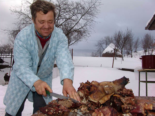 N-a mai mâncat nimic de ieri, parca simtindu-si sfârsitul aproape. Se da cu greu prins. Pâna la urma oamenii îl înfasca hotarât. Animalul se zbate din toate puterile dar, degeaba. Este tras spre locul în care zapada a fost deja bine batatorita, trântit pe o parte. Flacaul îl încaleca si îi înfige cutitul în gât. „Marele alb” îsi da ultima suflare dupa o jumatate de minut. Sângele i se prelinge pe zapada imaculata. De aici, mai departe totul e simplu. Familia Solomon din satul hunedorean Ghelar are asigurata si-n acest Craciun o masa mai mult decât îmbelsugata. Niciodata nu au cumparat carne de porc de Craciun si nu dau impresia ca ar avea de gând sa o faca vreodata. Si-n plus, pentru ei e mult mai rentabil asa.
