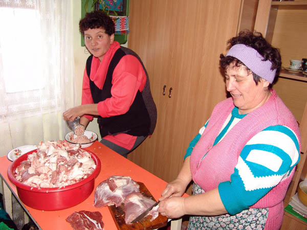 Maria Solomon (dreapta) are un ajutor de nadejde la pregatirea carnii pentru cârnati, verisoara ei Daniela