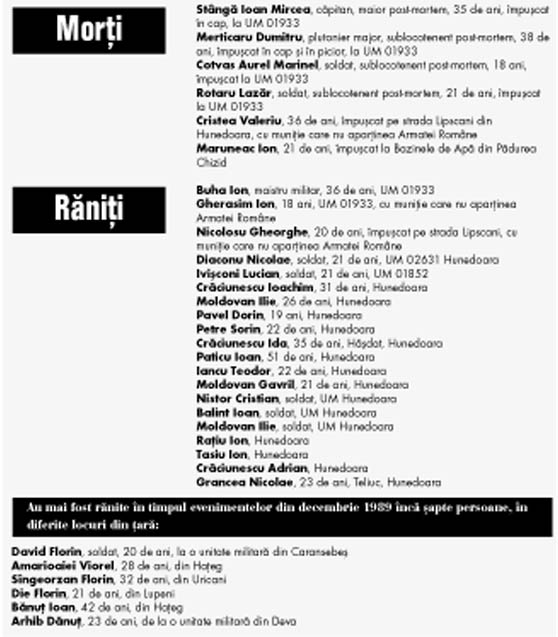 ![]() Prima persoana care a murit īmpuscata la Hunedoara, īn data de 22 decembrie 1989, īn jurul orei 19 1930, a fost plutonierul major Dumitru Merticaru, de 38 de ani, la unitatea militara din Hasdat. Sublocotenentul post-mortem a fost īmpuscat īn cap si īn piciorul drept. Apoi, a fost ucis capitanul (maior post-mortem) Ioan Mircea Stānga, 35 de ani. Si acesta a fost īmpuscat īn cap. Unul dintre participantii la evenimentele din decembrie, profesorul Ion Dinis, declara: „Pentru mine ramāne un mare mister cum a fost posibil ca un ofiter si un subofiter din Armata Romāna sa fie īmpuscati īn cap, īntr-o unitate militara, cānd deja afara era īntuneric. Nu pot sa-mi explic nici astazi ce s-a īntāmplat acolo”. Zilele urmatoare, sunt īmpuscati mortal la aceeasi unitate militara soldatii Cotvas Aurel Marinel,18 ani, si Lazar Rotaru, 21 de ani. Īn total, īn Hunedoara, au fost sase oameni ucisi si 19 raniti. Misterul ramāne si īn cazul unui tānar de 20 de ani, Gheorghe Nicolosu, īmpuscat īn picior, la intrarea pe strada Lipscani, pe lānga Gradinita ICSH. Gheorghe Nicolosu a fost īmpuscat ziua. Din informatiile pe care ni le-au furnizat revolutionarii reiese ca o echipa de oameni īnarmati s-a dus pe strada Lipscani, dupa ce au existat informatii ca teroristii ar trage din casa fostului vicepresedinte al Sfatului Popular, Viorel Raceanu. Florin Ghiuzela īsi aminteste astazi: „Nu stiu de unde a venit informatia ca se trage din casa lui Raceanu. Nu s-a tras de acolo, asta e sigur, dar focul a fost deschis de undeva din zona. Mai tārziu, dupa ce Gheorghe Nicolosu a fost operat, am aflat ca glontul cu care a fost īmpuscat nu figura īn dotarea Armatei Romāne. De altfel, medicii mi-au spus ca e vorba despre un cartus exploziv. Nicolosu a fost operat īn prima faza la Hunedoara, apoi a ajuns īn Italia, unde a suferit īnca o interventie chirurgicala efectuata de medicul care l-a operat si pe celebrul fotbalist Paolo Rossi. Ce m-a māhnit cel mai tare a fost faptul ca am fost nevoiti sa intervenim pe la diverse cunostinte, care sa-l ajute pe Gheorghe Nicolosu sa ajunga īn Italia. Banii din „Fondul Libertatea” nu s-au mai gasit. Macar atāt puteau face pentru un om care si-a riscat atunci viata”. Tot īn zona aceea, pe Lipscani, a fost īmpuscat, īn stomac, tot cu munitie care nu apartinea armatei, Cristea Valeriu, de 36 de ani. El a decedat cāteva ore mai tārziu, medicii īncercānd sa-i salveze viata, dar glontul exploziv i-a perforat intestinele. ![]() Un alt tānar, care a fost ranit īn spate, īn incinta UM 01933, a fost īmpuscat cu munitie care nu apartinea armatei. Este vorba despre Ion Gherasim, de 18 ani. Florin Ghiuzela spune ca: „Gherasim a fost operat la Hunedoara, dar luni īn sir rana nu i se īnchidea. Cu acea rana īn spate, tānarul s-a angajat īn combinat, unde lucra la cuptoare industriale. L-am cautat dupa cāteva luni de la Revolutie. Rana supura īn continuare. Am reusit sa-i fac rost de un bilet pentru Campionatul Mondial de Fotbal din Italia, īn speranta ca acolo va reusi sa ajunga la un doctor care sa īl poata trata. Si a avut noroc. Impresionat de suferinta tānarului, primarul din Telese Terme l-a ajutat. A chemat un doctor, care l-a facut bine. Īntors īn tara, romānii au considerat ca Ion Gherasim poate sa-si satisfaca stagiul militar si l-au īncorporat la parasutisti. A avut din nou probleme cu rana. Dupa cāteva luni, l-au lasat la vatra. Fostul primar Maris i-a dat apoi o locuinta”. Ion Maruneac, de 21 de ani, a sasea persoana care si-a pierdut viata, a fost īmpuscat īn cap, īn zona bazinelor de apa din padurea Chizid. ![]() |